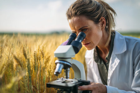 A dedicated researcher analyzes wheat samples using a microscope in a vast golden field under clear skies. The focus is on agricultural science and innovation.