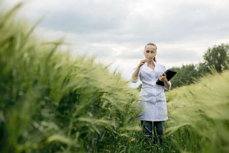 Biologist woman wearing glasses and studying botanical plants in nature with a magnifying glass. Botanist woman checking wheat growth characteristics