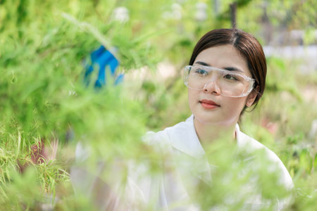 Marijuana researcher Asian woman working in a hemp field, Examining plants. Concept of herbal alternative medicine.
