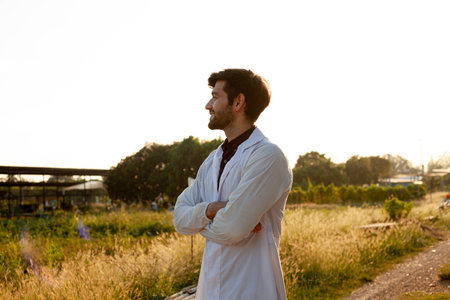 Agricultural scientist conducting research on corn crop, performing genetic modification tests in cultivated field for improved yield and quality