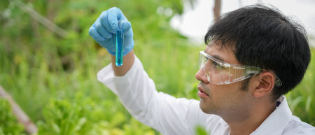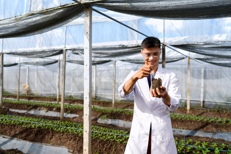 Asian man in lab coat and safety glasses putting soil sample into test tube doing research in greenhouse.