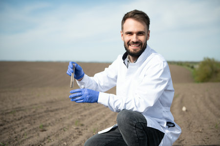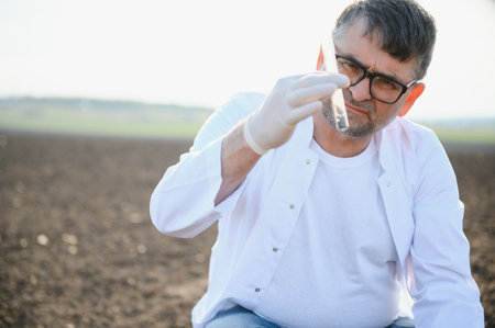 Agricultural scientist wearing lab coat and gloves dropping corn seed in test tube in cultivated corn field for quality control and gmo testing