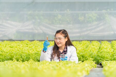 Scientists test the solution, Chemical inspection, Check freshness at organic, hydroponic farm.