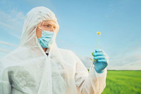 Scientist man in biohazard uniform is analyzing green plant on nature in summer