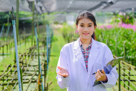 Asian scientist man with white lab gown analysis and record the data of white and multicolor flowers in the garden during day time.