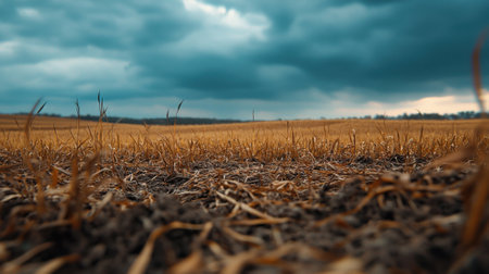 Close up view of dry wheat stubble field after harvest showing texture of straw and rural agricultural landscape