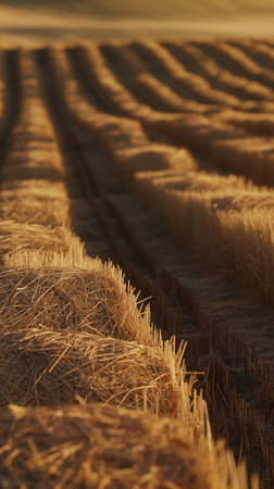 Threshed straw windrows in diagonal lines muted golds open lower copy field representing agriculture pattern suitable for farming editorial mapping and background design