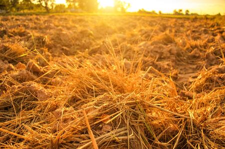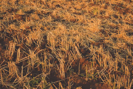 Dry straw in the field after harvest, at sunset. Background or texture.