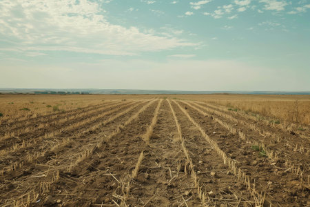 Farmland with neatly plowed rows stretching towards horizon, clear blue sky setting, highlighting vast expanse of agricultural potential, concept of farming, crop production, rural landscape.