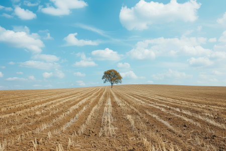 Lone tree on the field of cut crops with sun rays breaking through the clouds