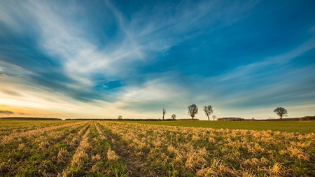 Early spring fields at sunset. Natural landscape of polish countryside.