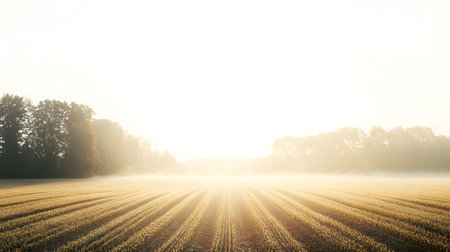 Harvest Time in the Golden Field with Atmospheric Fog.
