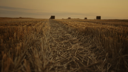 Haystack wheat field landscape at golden autumn sunset. Walking row of stubble harvested barley farmland after grain crop. Evening cutting cereal stalks dry hay bales. Rural countryside concept.