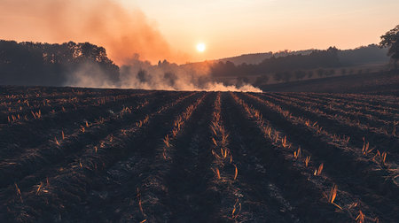 The image captures a picturesque sunrise over a freshly plowed field. Soft smoke, silhouetted trees, and vibrant sunlight create a serene atmosphere.