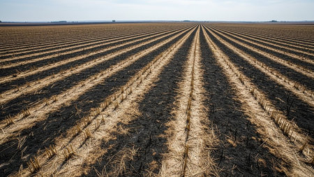 A wide agricultural field distinct parallel rows of dry stubble and dark soil, stretching towards a clear blue horizon under bright sunlight.