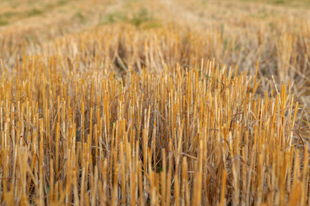 Close up of yellow field after harvesting. Harvested wheat field with remaining plant stubble. Selective focus.