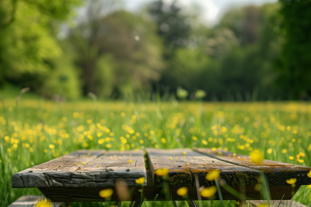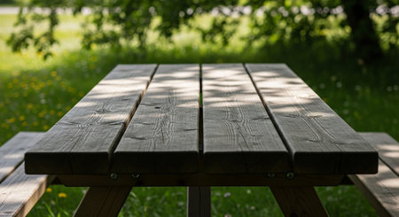 Weathered wooden picnic table with rough planks in focus, set outdoors in a sun drenched green park with blurred trees in the background, offering ample copy space.