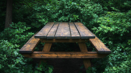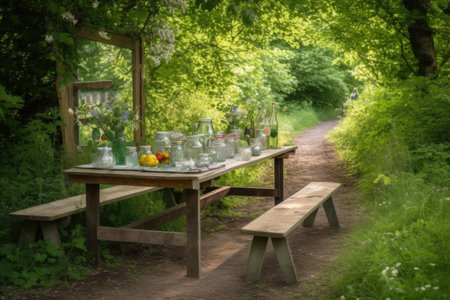a picnic table, with glasses and plates, surrounded by greenery, created with generative ai