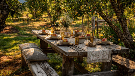 Enjoy a charming picnic table setting surrounded by apple trees, featuring plates, glasses, and fresh apples in a beautiful orchard under the sun.