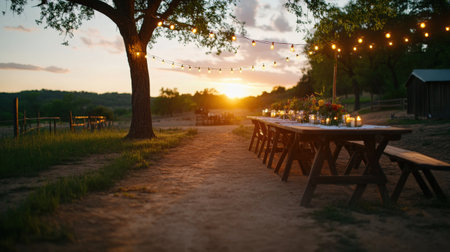 Rustic ranch boho wedding reception at sunset with wooden tables and string lights.