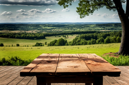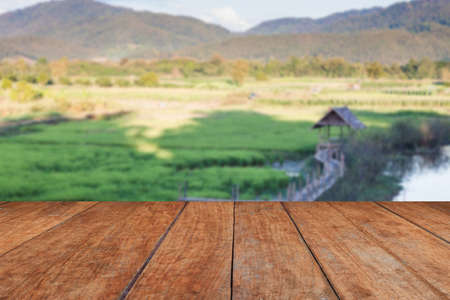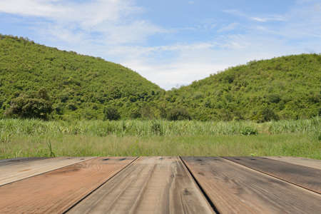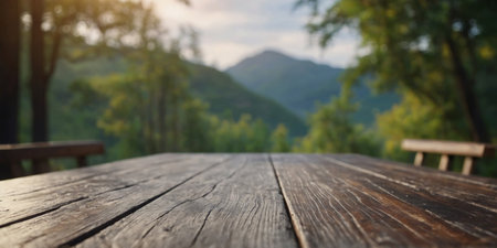 Empty wooden table with garden with a country outdoor theme,Template mock up for display of product. Wood texture background, wood planks.