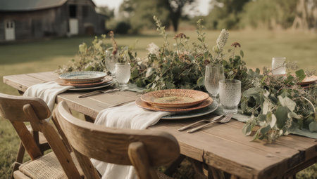 A beautifully decorated wooden table set for an outdoor event. The table features a lush green garland centerpiece, elegant plates, and glasses in a rustic countryside setting.