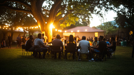 Group of friends enjoying an outdoor gathering under string lights in a backyard setting at dusk