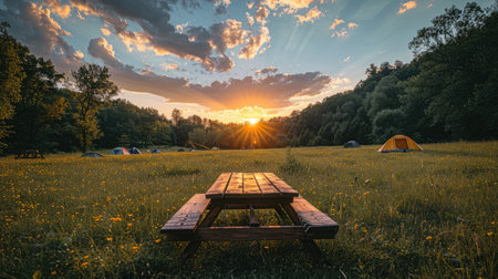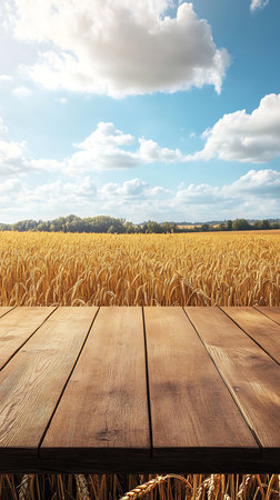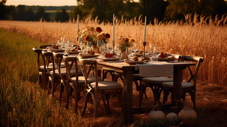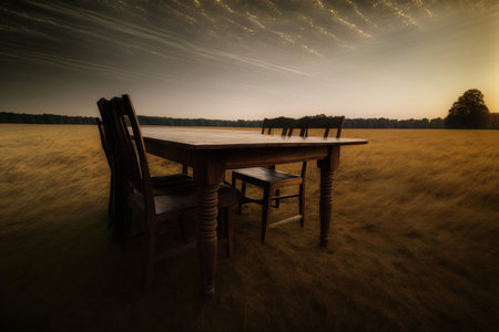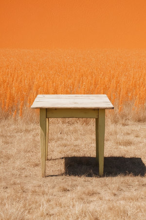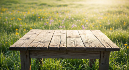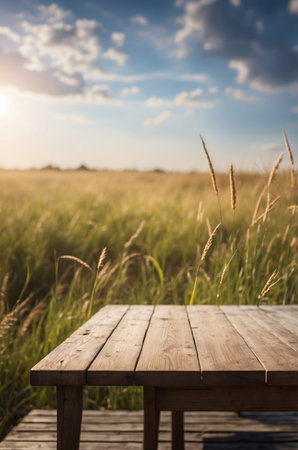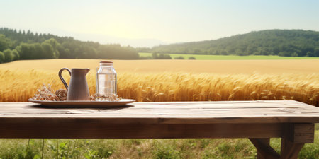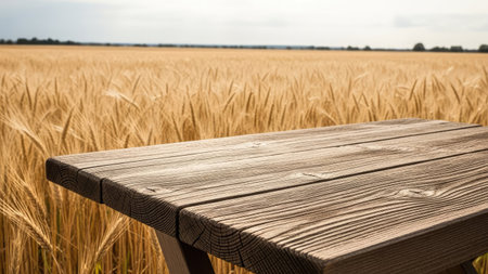 A rustic wooden table set against a backdrop of golden wheat fields at sunrise. This serene outdoor scene evokes feelings of tranquility and beauty in nature.