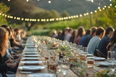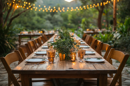 Wooden table elegantly set for an outdoor dinner, illuminated by warm string lights, creating a cozy and inviting atmosphere