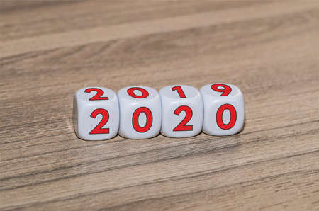2020 New Year Concept. Close up of wooden number block toy on ground with bokeh green leaf nature background and copy space for text.