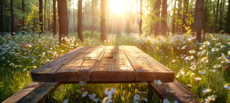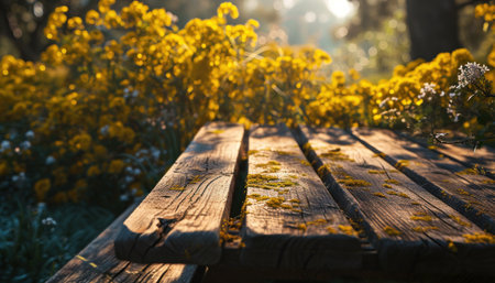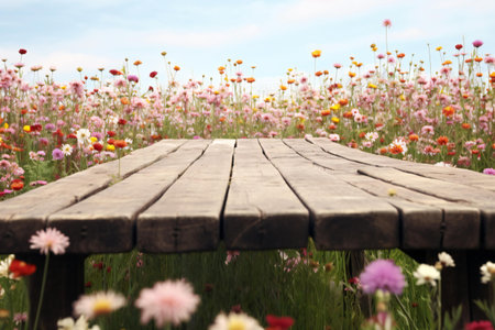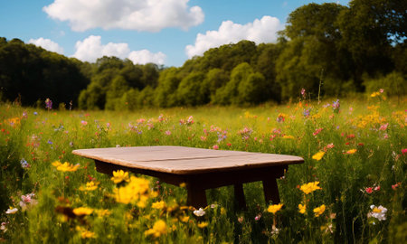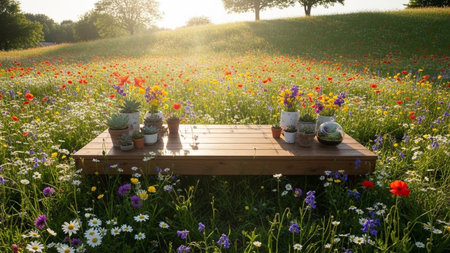 A wooden platform table is placed in a sun-drenched wildflower meadow bursting with red, yellow, white, and purple...