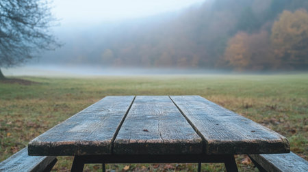 Foggy park with a simple wooden table in the foreground, twilight hues and soft mist creating a peaceful and meditative setting