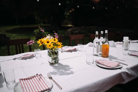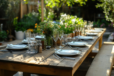 A charming outdoor table is elegantly arranged with plates and glassware, surrounded by lush green plants and colorful flowers under bright sunlight, perfect for a festive gathering.