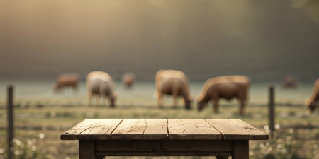 AI Generated. Empty Wooden Table Presents Blurred Farm Animals in Background with Soft Sunlight