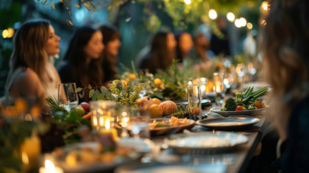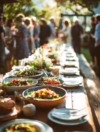 Warm sunlight illuminates an inviting table filled with vibrant, appetizing dishes while friends share laughter and conversation in a lively garden celebration.