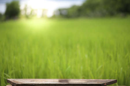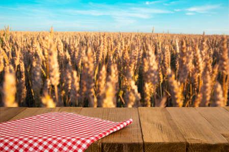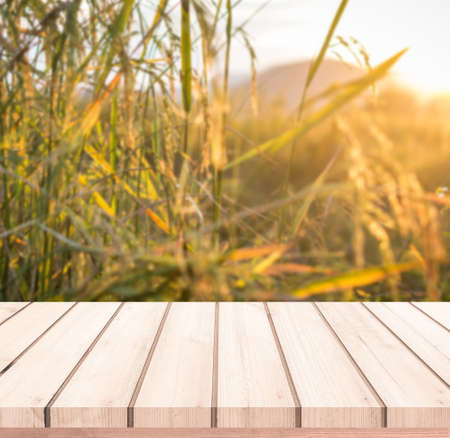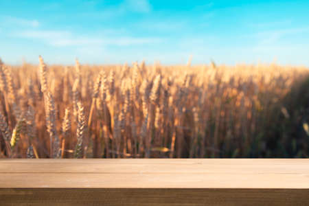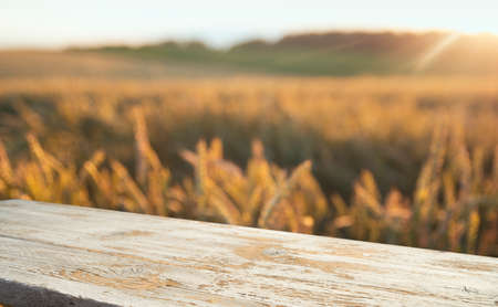 Empty wooden deck table over wheat field with sunset or sunrise. Ready for product montage
