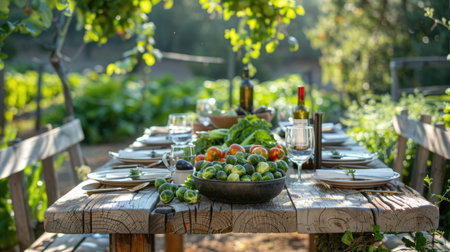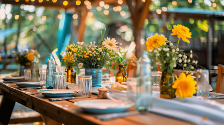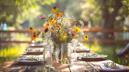 A long rustic table adorned with flowers invites guests to an enchanting evening. Warm sunlight filters through trees, creating a cozy atmosphere for joyful conversations and delicious food.