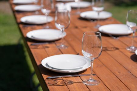 Elegant Served Restaurant Tables on wooden terrace outdoors