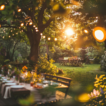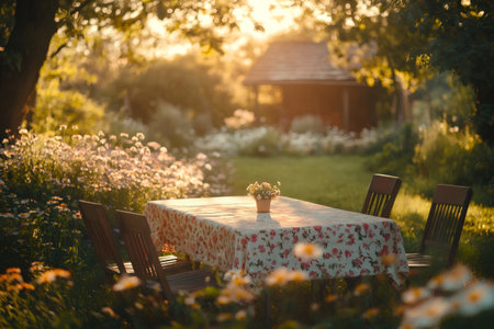 Serene garden scene with a table and chairs set for an evening meal, bathed in the warm glow of the setting sun