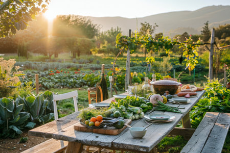 Rustic outdoor table laden with fresh vegetables and bread, ready for a sunset dinner in a verdant garden landscape.