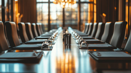 Corporate boardroom with long conference table, multiple screens, and notepads ready for meeting