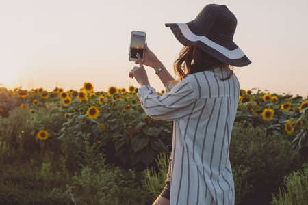 Mobile photography, woman take a photo of sunflower field at sunset