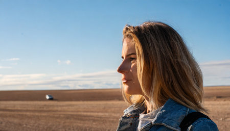 Young woman in the middle of a field with a car in the background