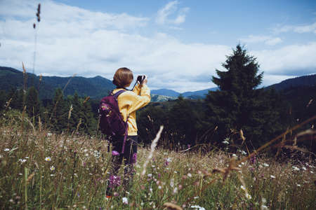 tourist girl with a backpack and camera standing in the meadow at the mountains. Carpathians. Ukraine