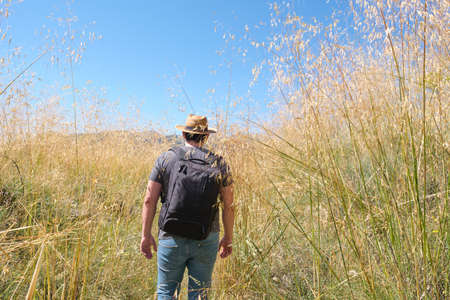 Young caucasian man with a straw hat hiking through a high plants field. Mushroom rocks path (Ruta de las Piedras Seta), Madrid, Spain.