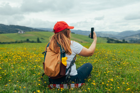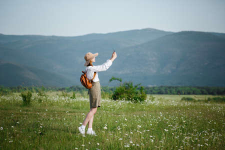 Woman tourist with backpack take selfie photo over mountain landscape trekking. Hiking, sport, travel and technology concept. Back view