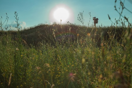 Young caucasian tourist with backpack walking on a green meadow at sunset