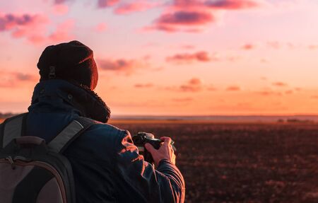 photographer with a tripod and camera takes a landscape during sunset in a large open area
