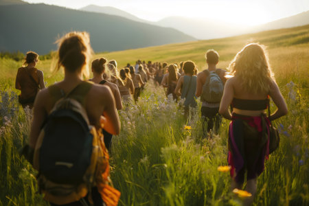 Large group of people walking through a meadow chanting mantras at sunset enjoying the peace and quiet of nature