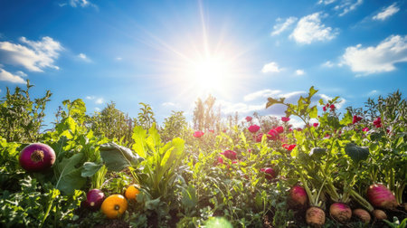 A beautiful view of a vibrant vegetable garden basking in bright sunlight. Fresh greens and colorful vegetables thrive under a clear blue sky, embodying nature's bounty.